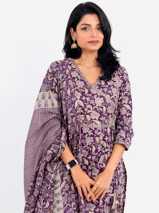 -58% OFFFloral Purple Lace Work Cotton Suit