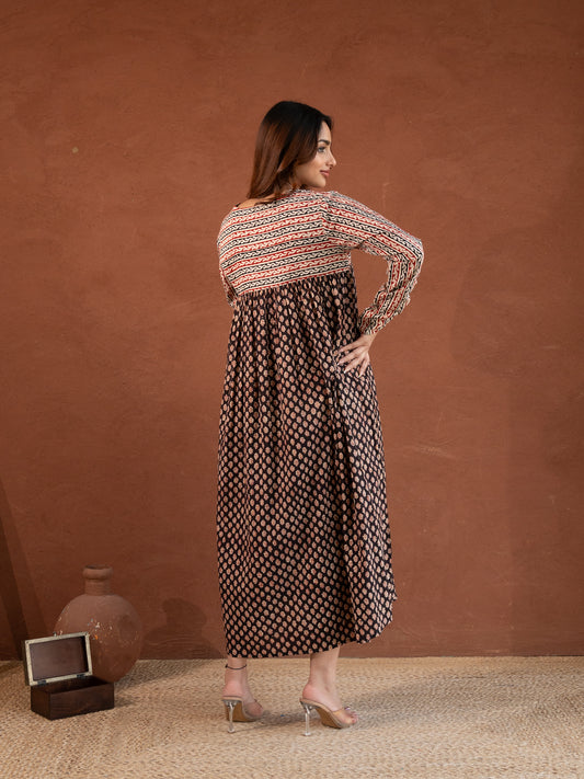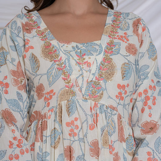 Beautiful Brown Block Print on Cream Anarkali Printed Cotton kurta