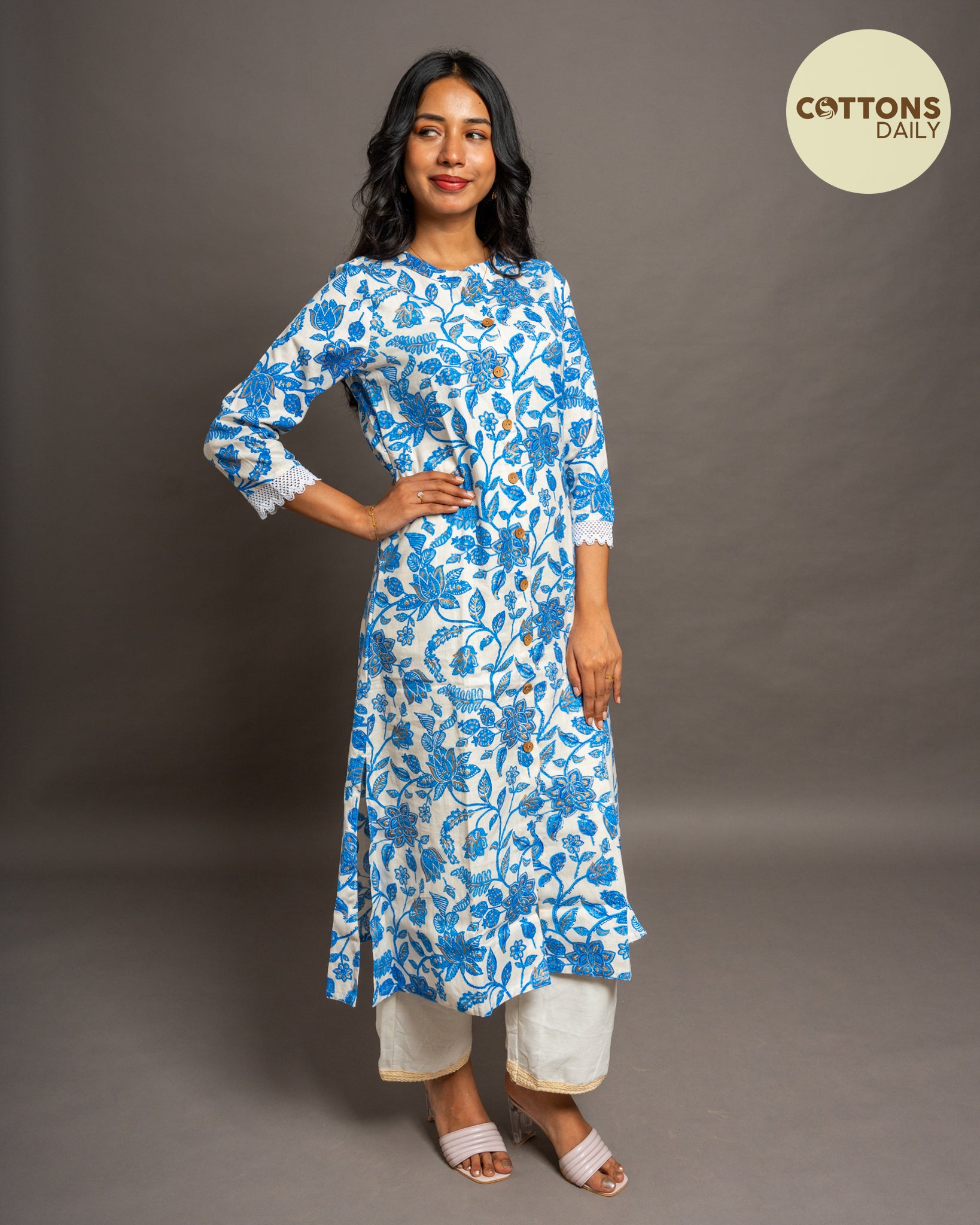 Kurta Colour : Off White Body with Blue Floral Print highlighted with Gold Glitter