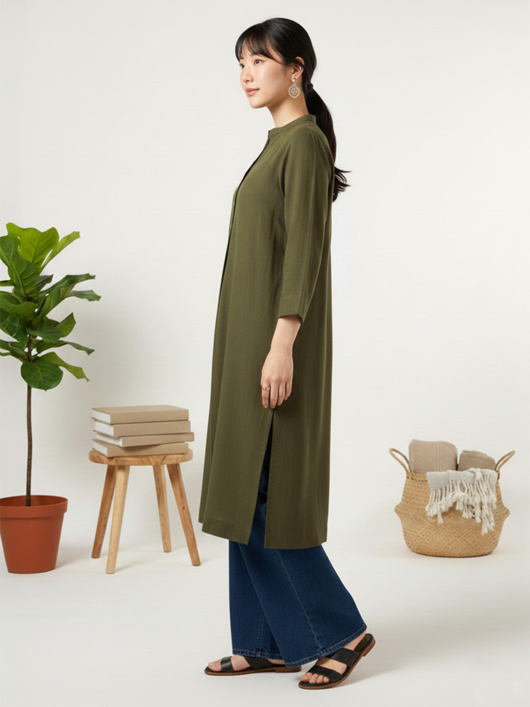 Classic Linen Army Green Straight Long Kurta
