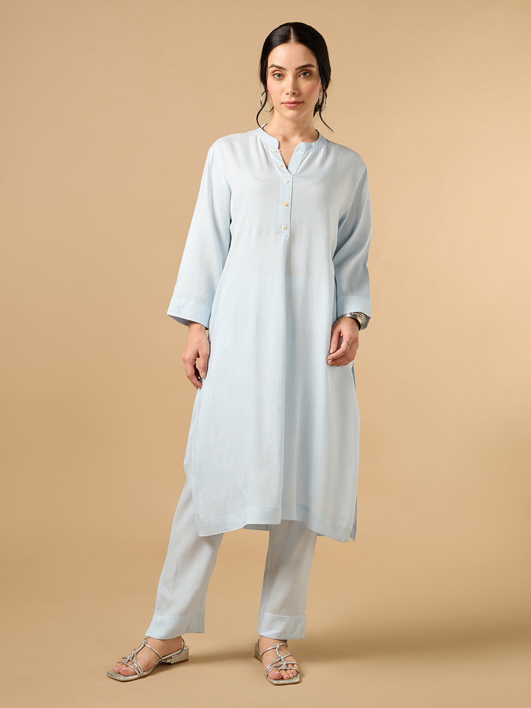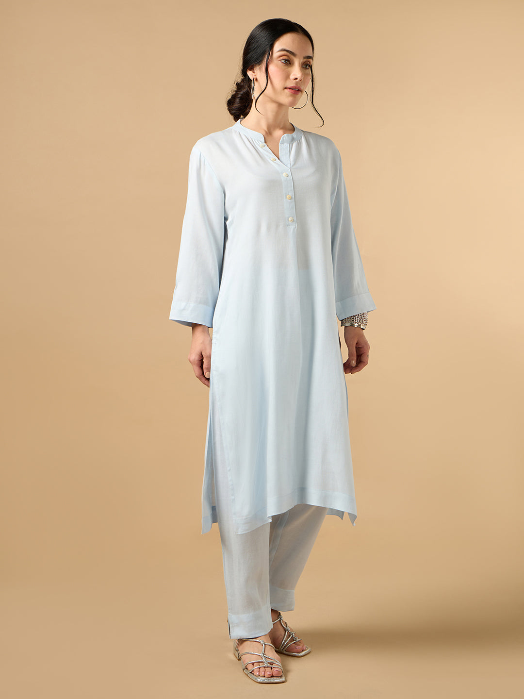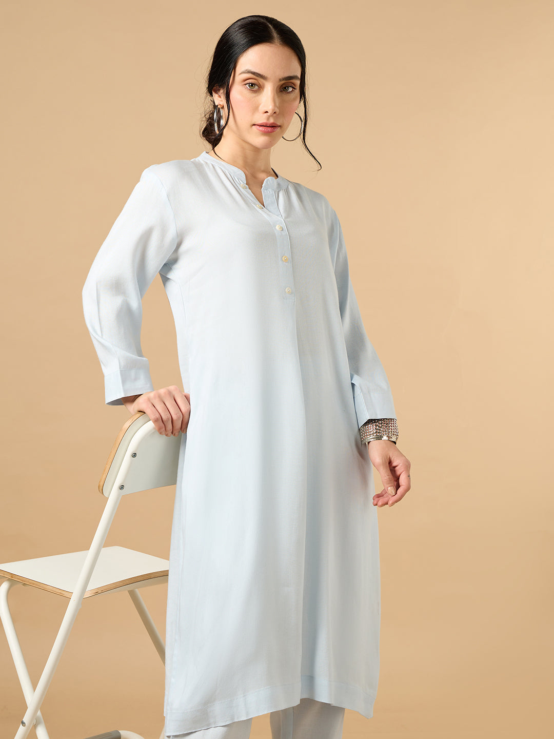 The solid Sky Blue color radiates a subtle charm, making it a versatile piece for festive occasions, casual outings, or semi-formal events. Featuring full sleeves, a sleek Mandarin collar, and a regular fit, this kurta ensures a flattering silhouette without compromising on comfort.