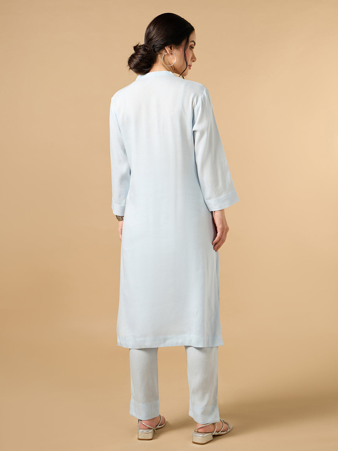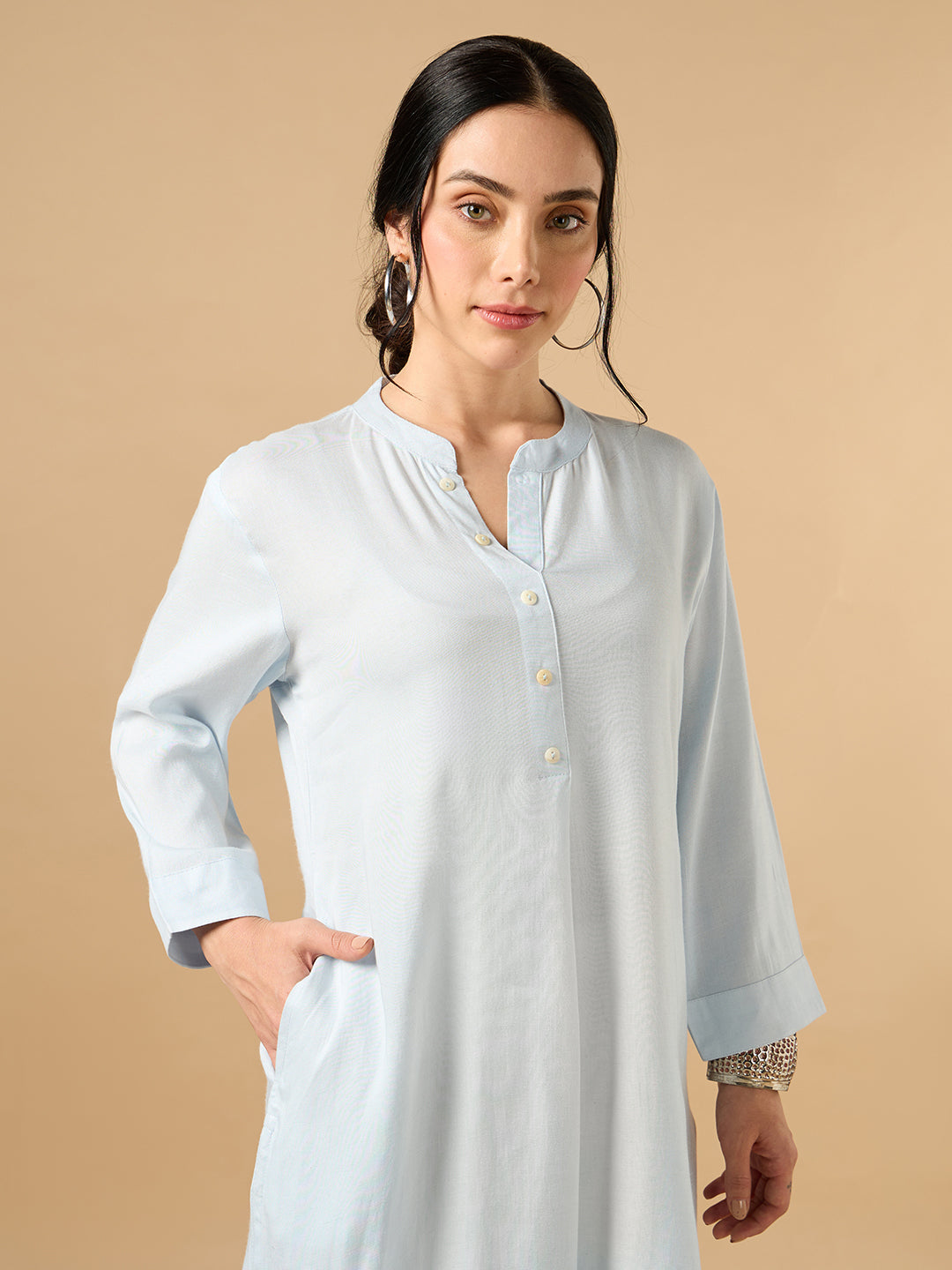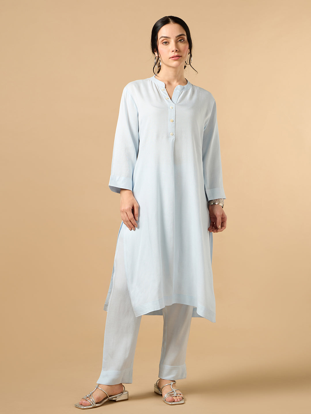 The solid Sky Blue color radiates a subtle charm, making it a versatile piece for festive occasions, casual outings, or semi-formal events. Featuring full sleeves, a sleek Mandarin collar, and a regular fit, this kurta ensures a flattering silhouette without compromising on comfort.