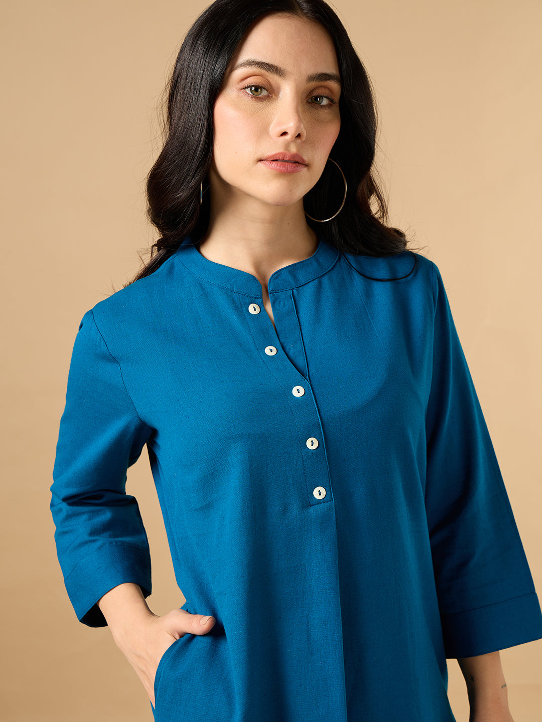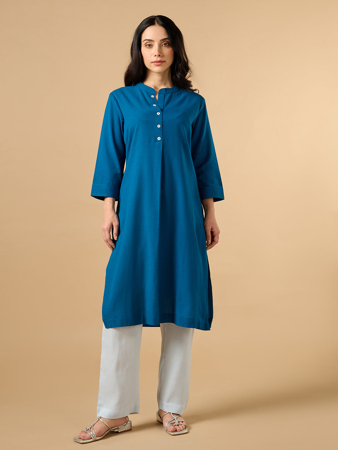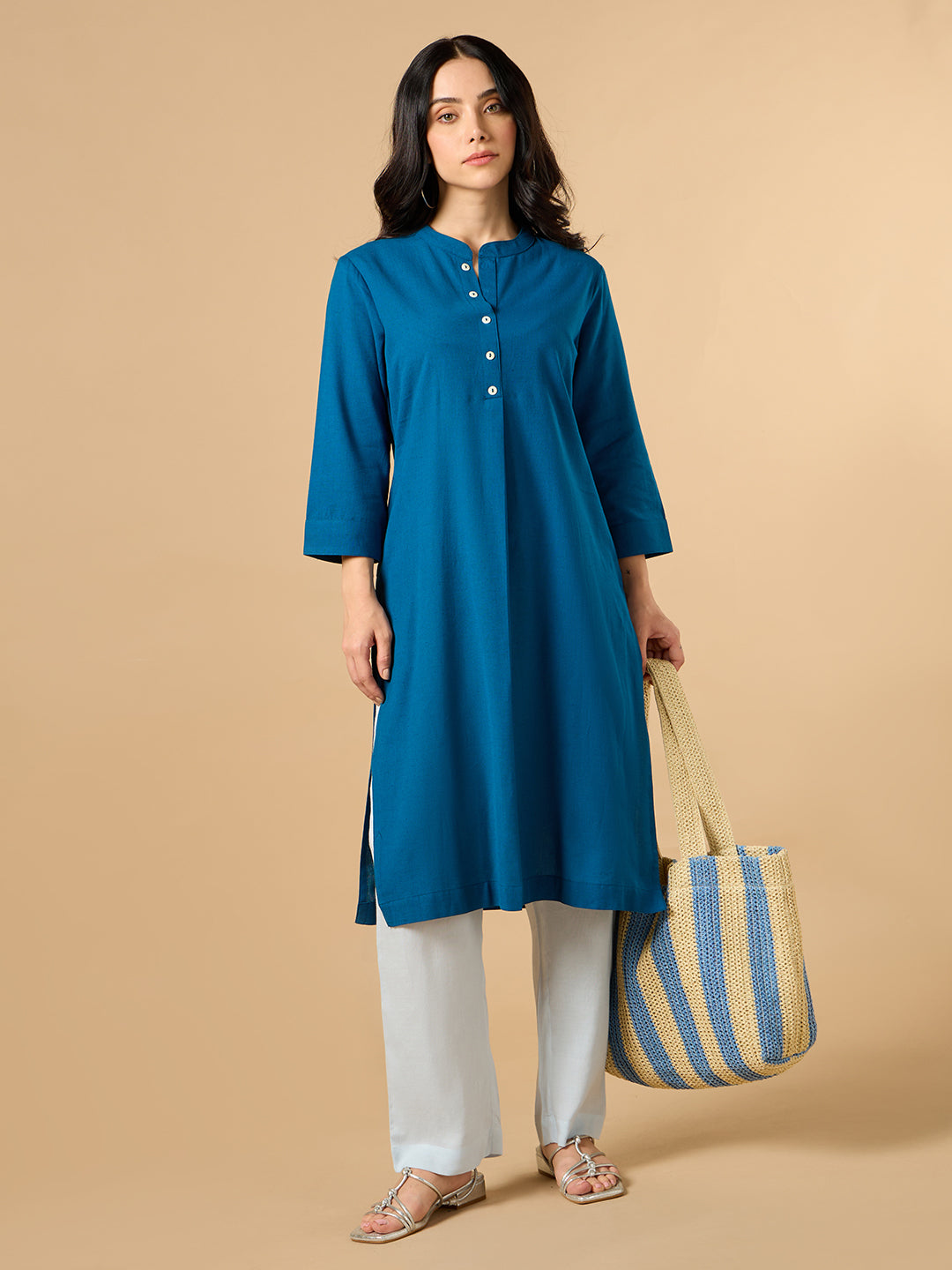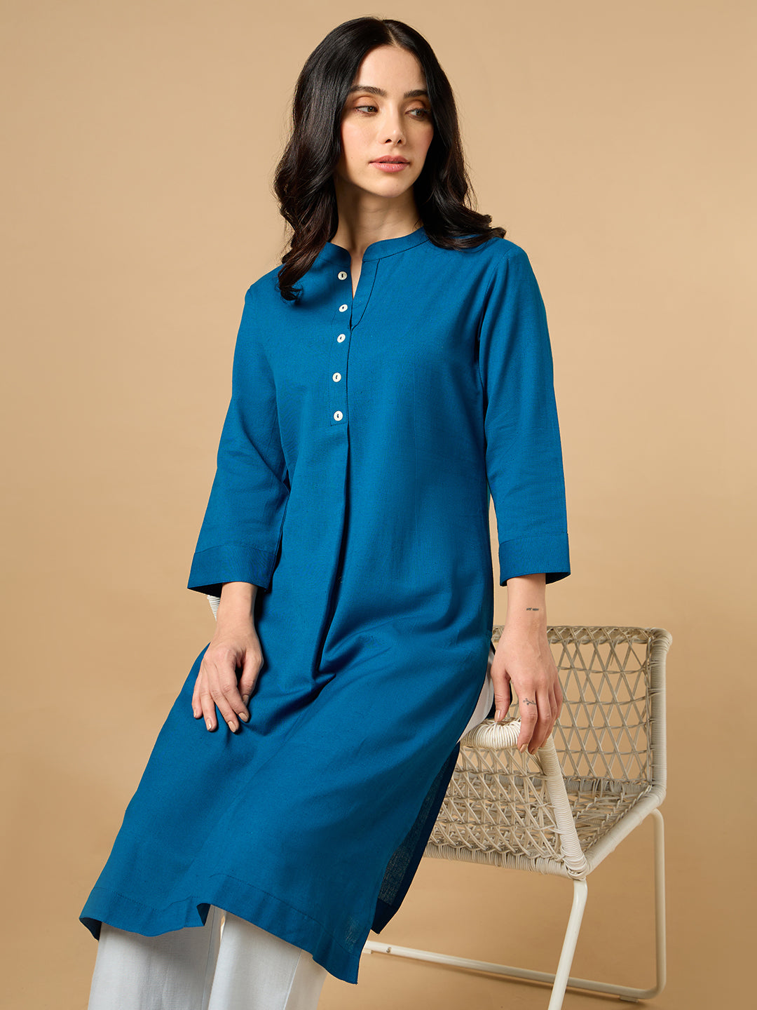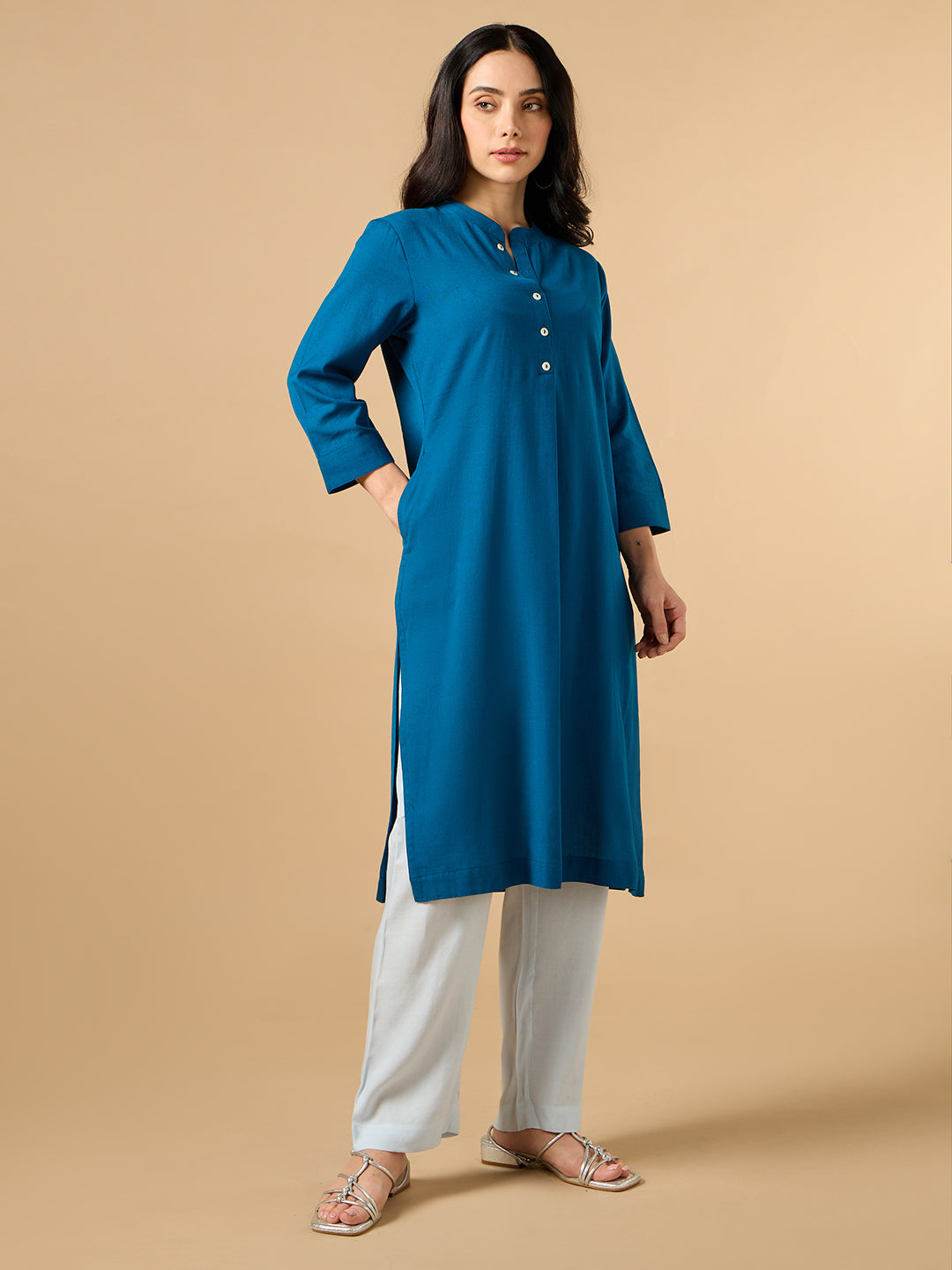Exude elegance and sophistication with the Classic Linen Spanish Blue Straight Long Kurta. Designed for both casual outings and formal wear, this piece blends comfort with a refined aesthetic.