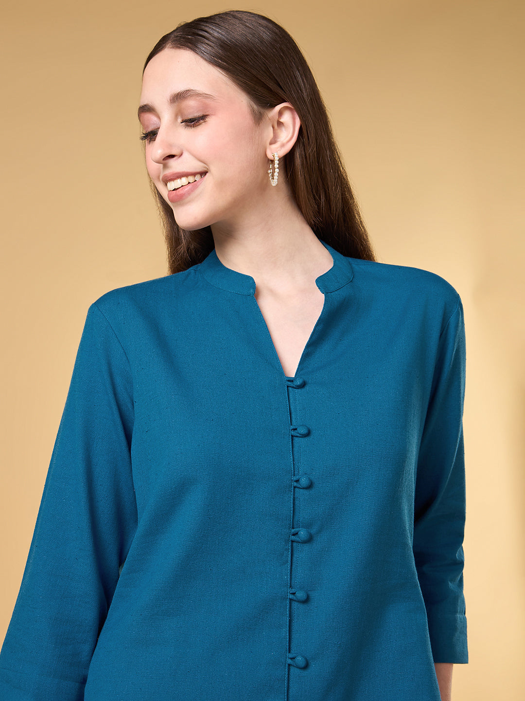 Stay effortlessly stylish in our Midnight Blue Solid Cotton Co-ord Set. Designed in premium cotton, this solid co-ord set brings together comfort, breathability, and timeless charm, making it your go-to outfit for any occasion. The elbow sleeves and collar neck add a structured, modern look, while the regular fit ensures an easy, flattering drape. Pair it with statement earrings or flats for a complete look.