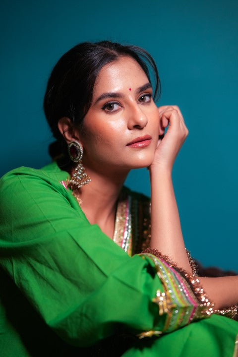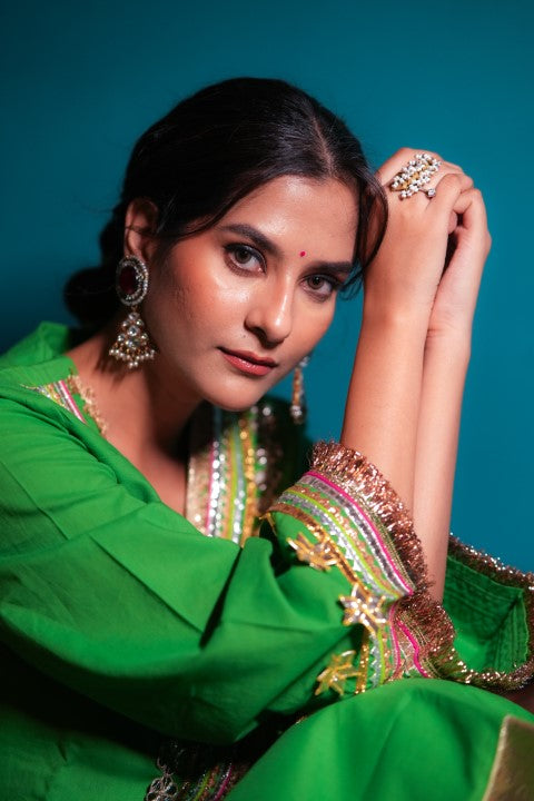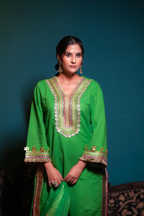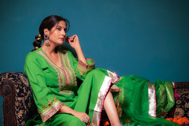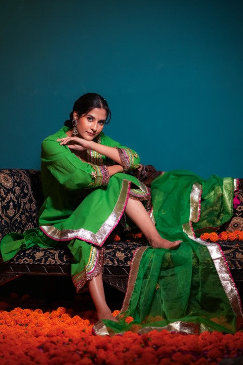 Embrace festive elegance with the Adaah Green Gota Patti Festive Suit. Designed in a vibrant green hue with intricate Gota Patti work, this suit adds a touch of tradition and style, making it perfect for festive gatherings and celebrations.