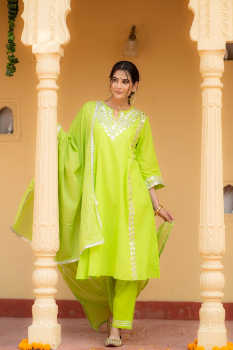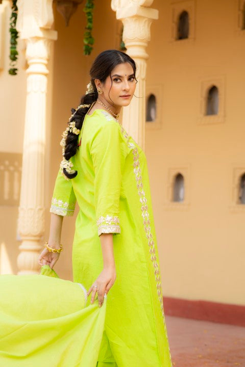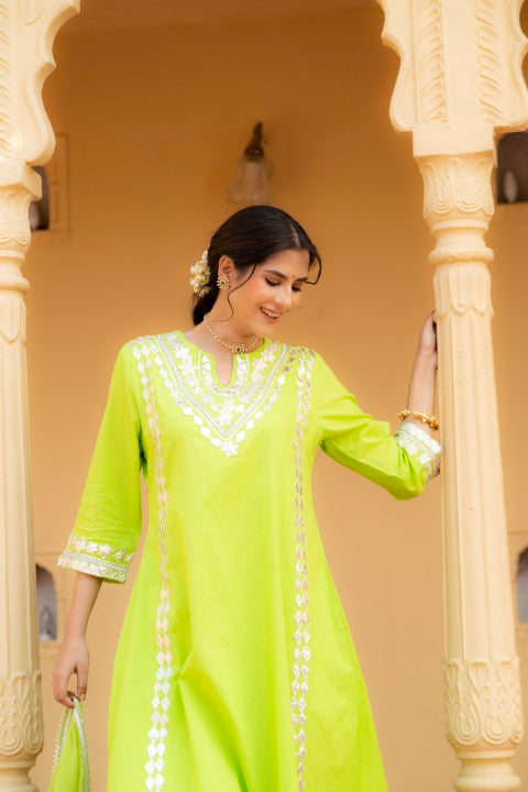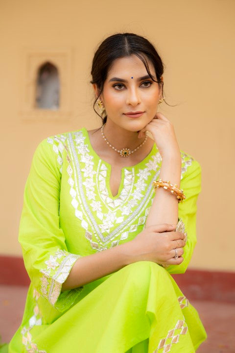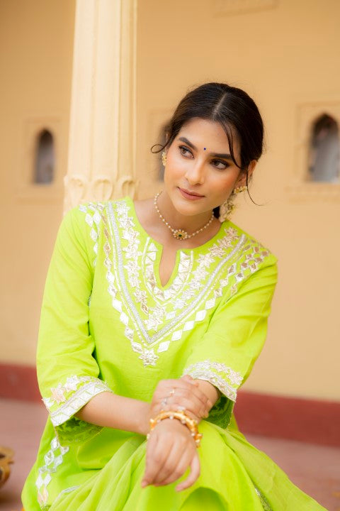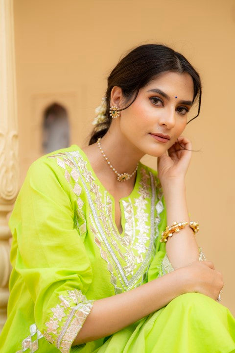 Brighten up your festive wardrobe with the Adaah Parrot Green Cotton Festive Suit. This stunning suit combines vibrant color and delicate Gota Patti work, making it the perfect choice for celebrations and gatherings.