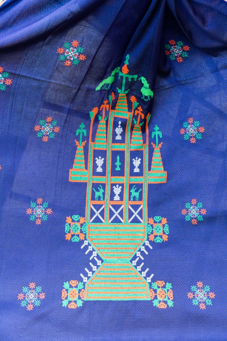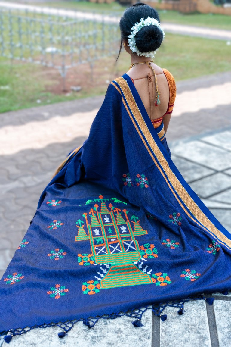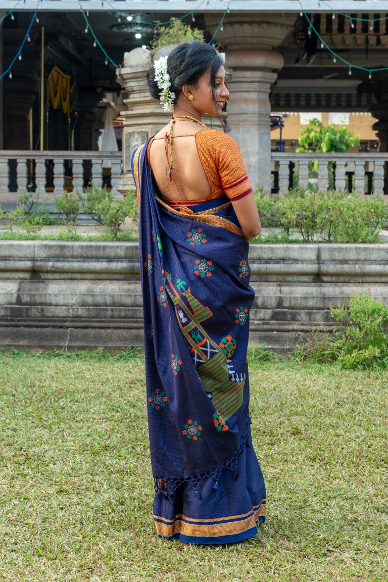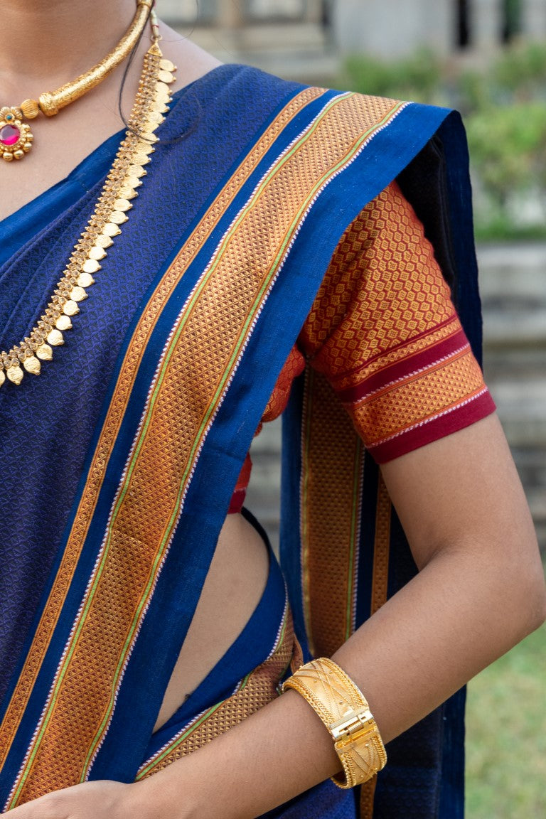 An interesting variant of the maharashtrian Khun Sarees, this Violet saree is crafted with rich Kasuti embroidery depicting Ratha (Chariot), parrots in negi menthi & gavanti stitches. Completed with a contrasting Navy Blue Gold border, this saree is paired with a Maroon Khun Blouse with Maroon Gold Border. Kasuti is a traditional form of folk embroidery practised in the state of Karnataka, India. It is a labour of love that involves embroidering very intricate patterns like gopura, chariot, palanquin, lamps, conch shells & even rangoli patterns of Karnataka. Different varieties of stitches are employed to obtain the desired pattern. These sarees use Gavanti (a double running stitch used for marking vertical, horizontal and diagonal lines), the Negi (a running stitch) and Menthi (a cross stitch resembling fenugreek seeds).