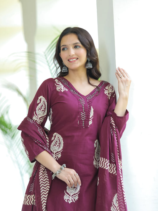 Dark Wine Paisley Printed Cotton Suit