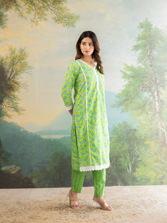 Floral Parrot Green Lace Work Cotton Suit