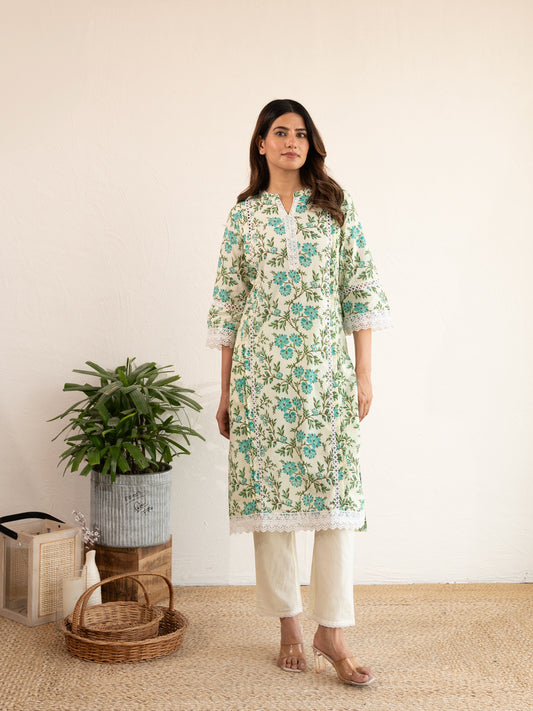 Ivory Floral Print Lace Work Cotton Suit