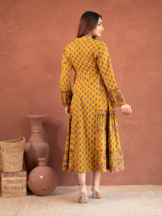 Turmeric Yellow Floral Print Cotton Dress