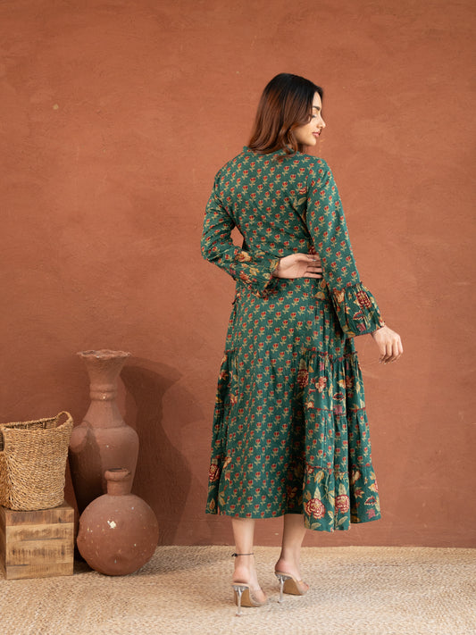 Forest Green Floral Print Cotton Dress