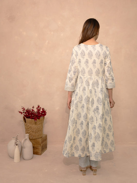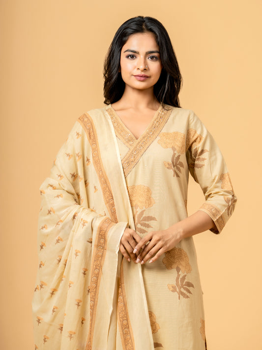Sahara Beige Block Print Angrakha Cotton Suit