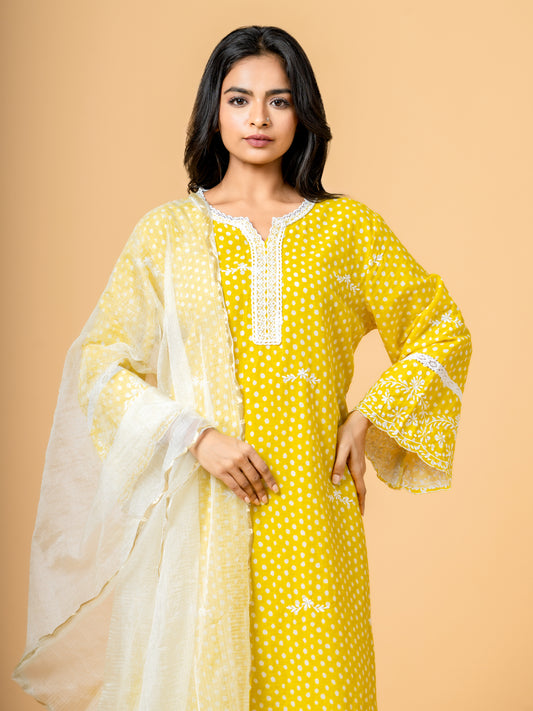 Yellow Polka Dot Lace Work Cotton Suit