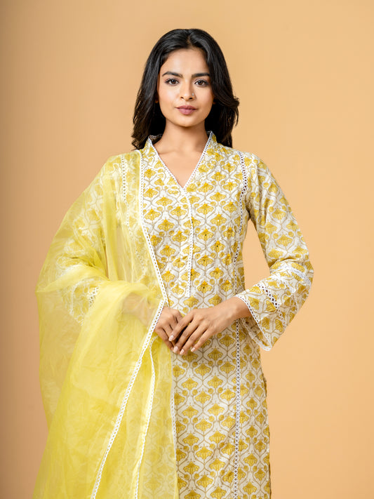 Mustard Yellow Lotus Printed Lace work Cotton Suit