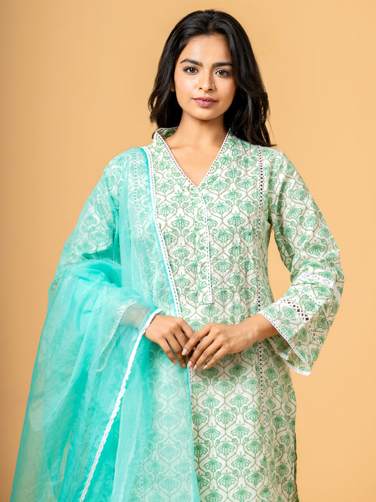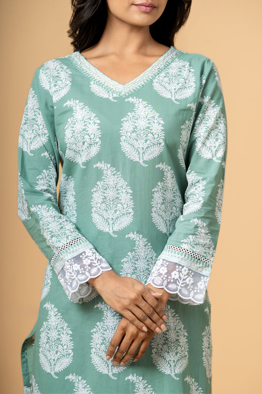 Seaweed Green Paisley Block Print Cotton Suit