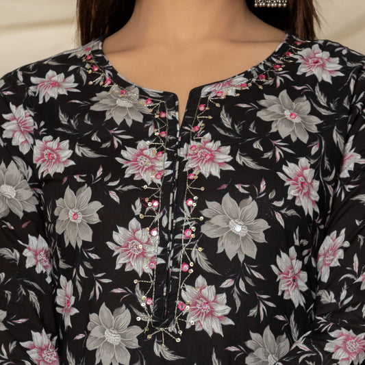 Black Poppy Flower Printed Cotton Suit