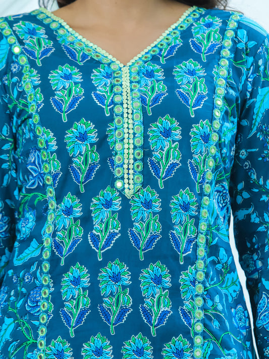 Turquoise Blue Floral Printed Cotton Suit