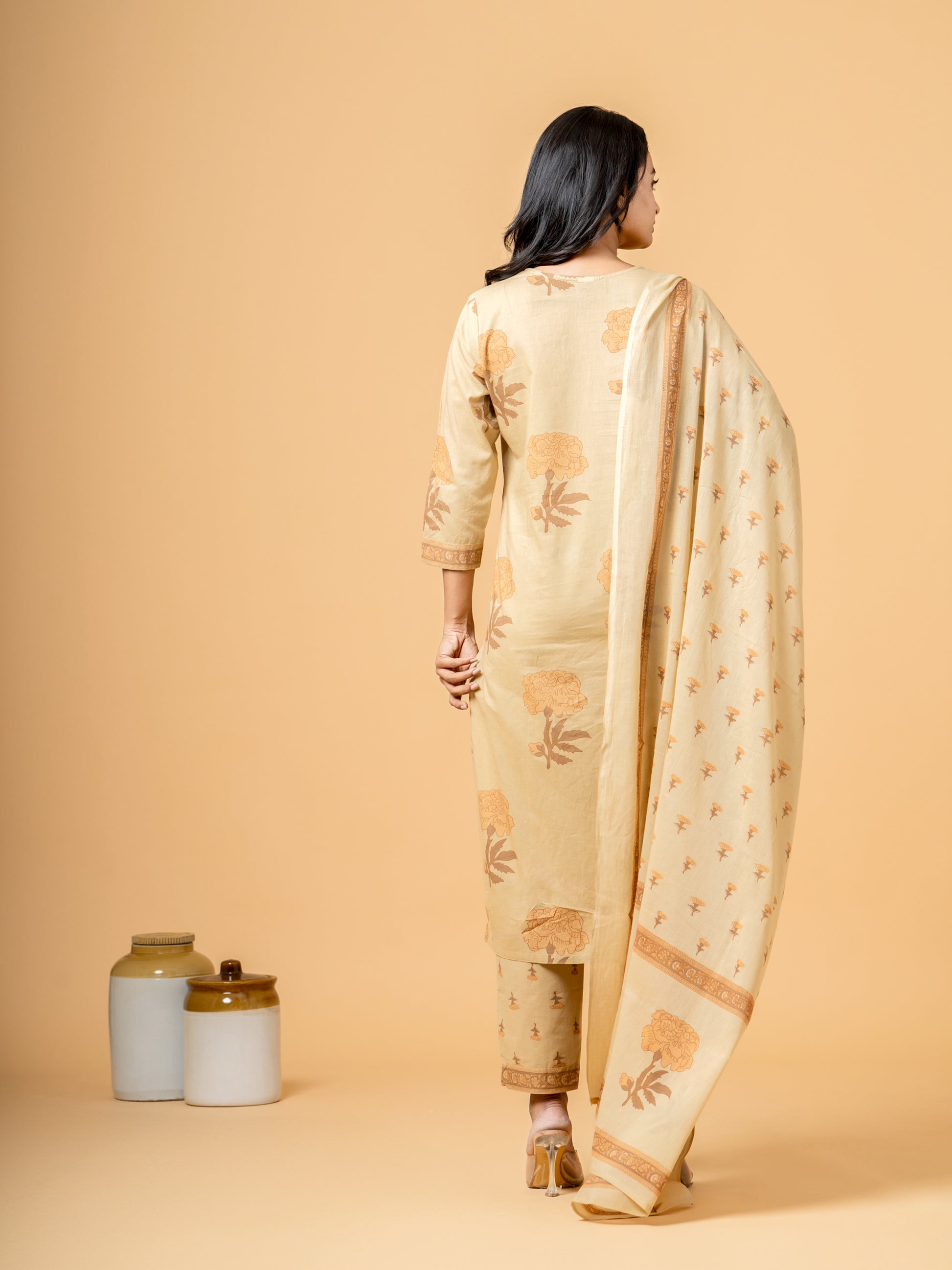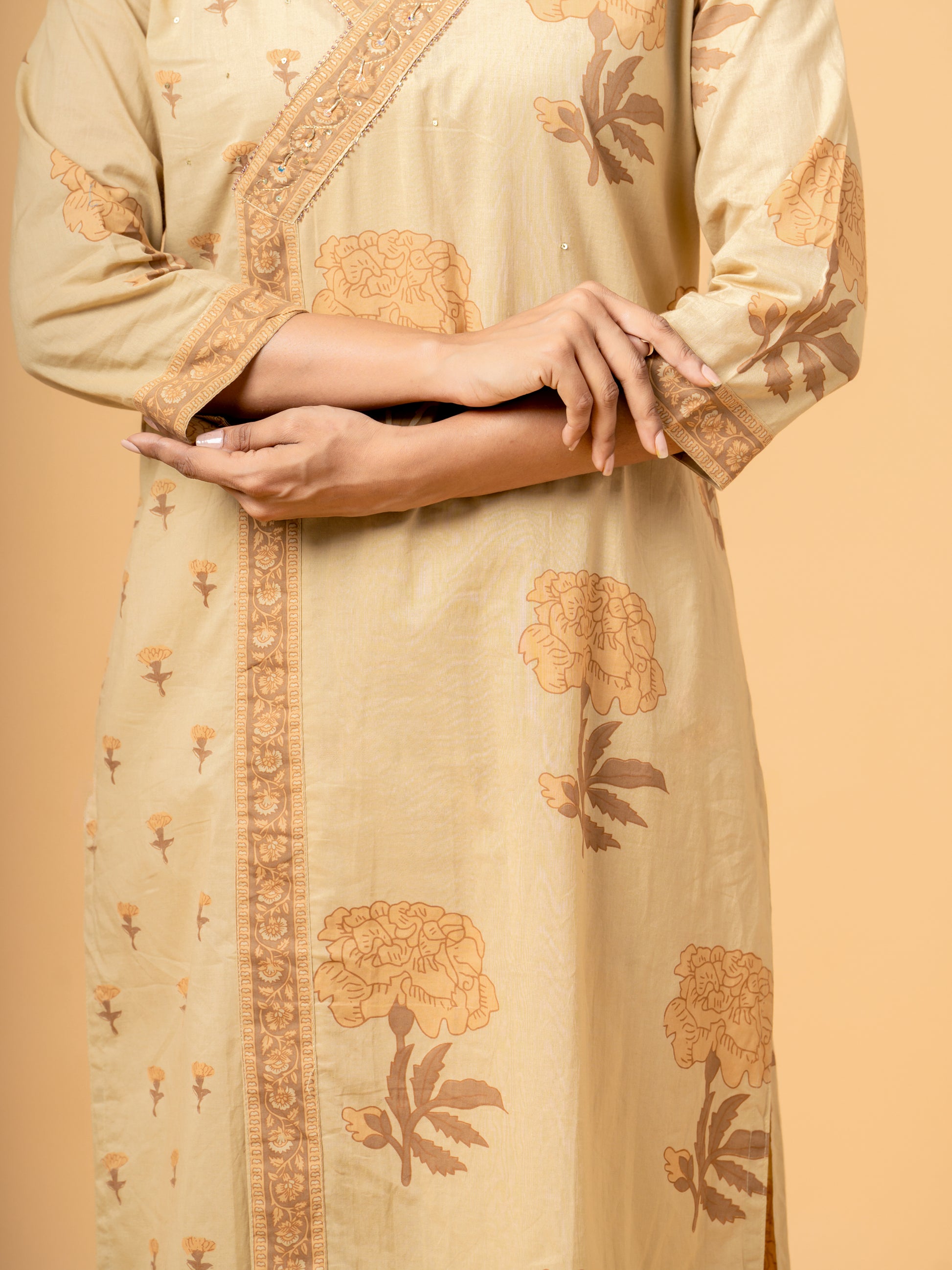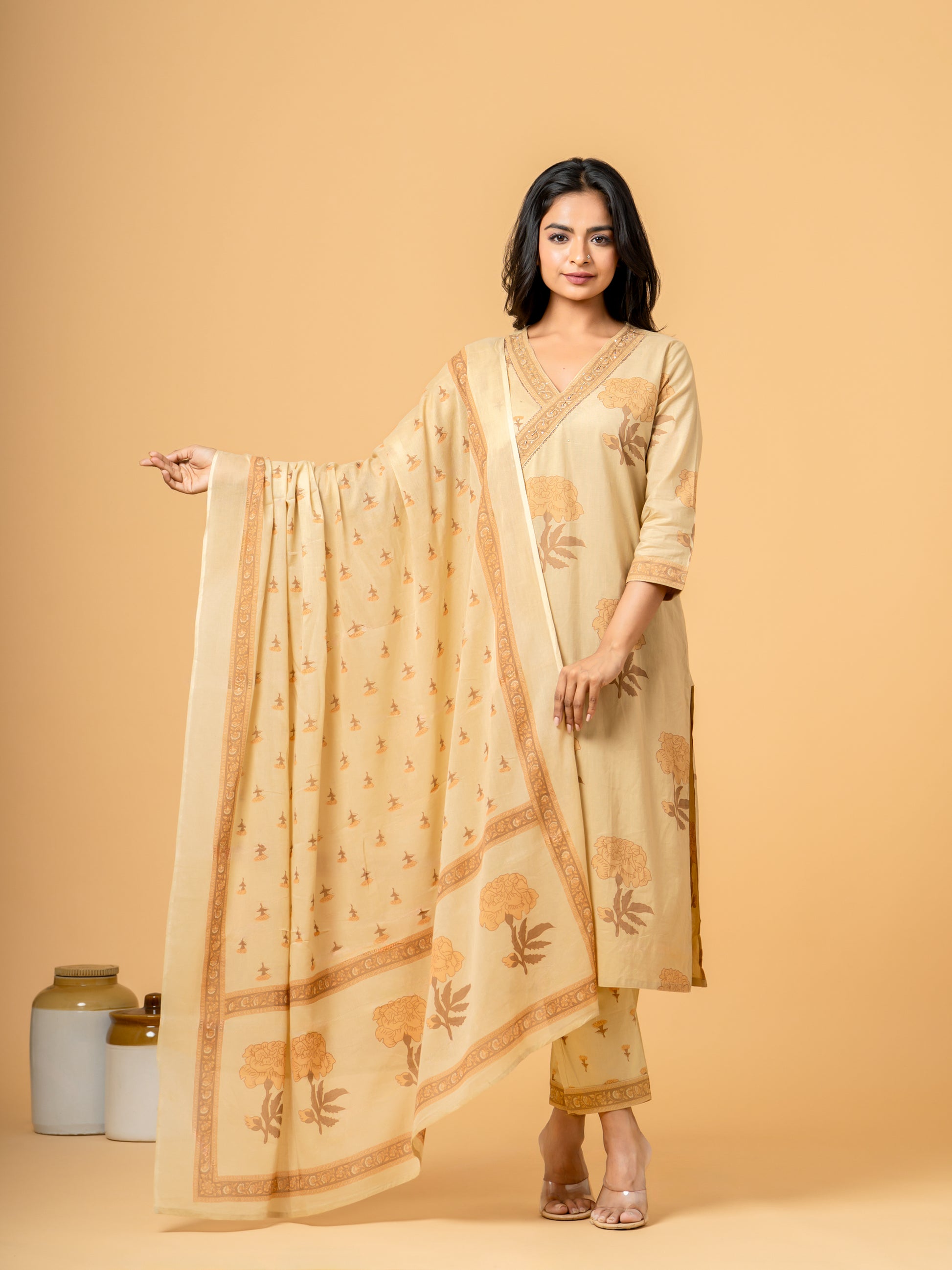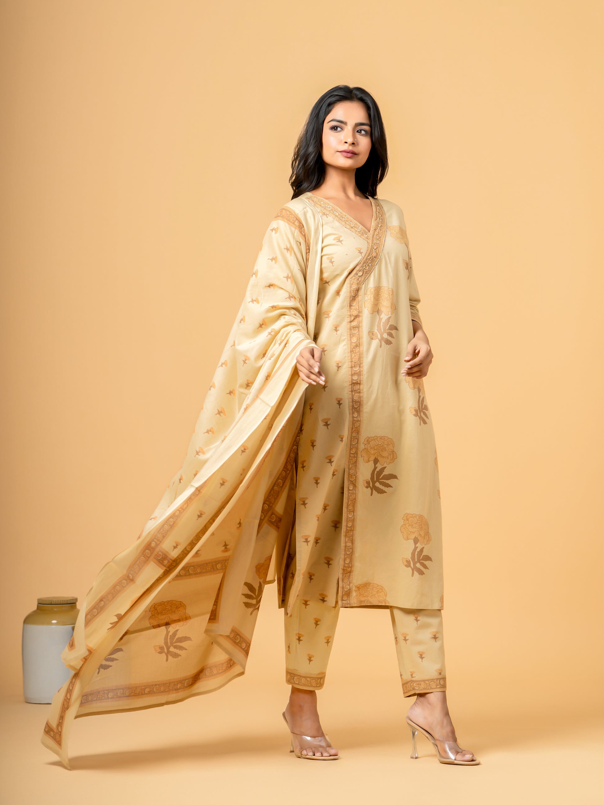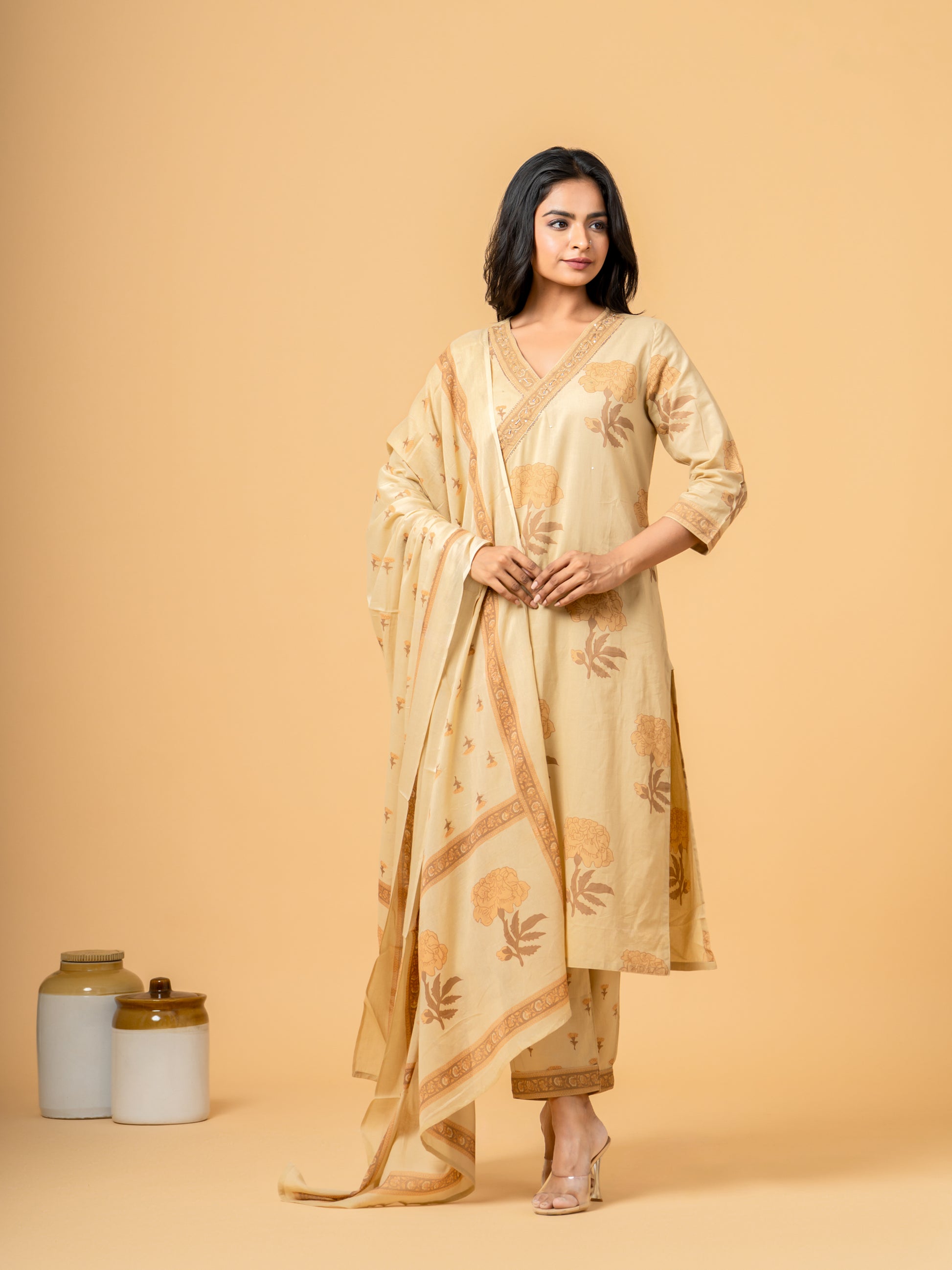 Embrace timeless elegance with our Sahara Beige Block Print Angrakha Cotton Suit, crafted from pure cotton with stunning Angrakha style and delicate zari and sequence work. This suit blends tradition with modern style, making it perfect for casual wear, festive celebrations, and party events.