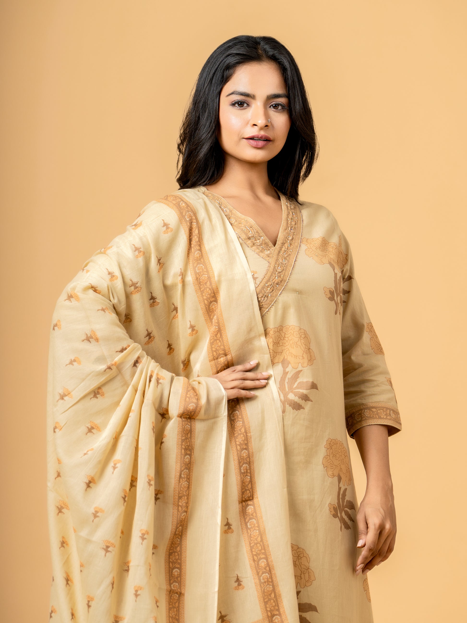 Angrakha Block Print Design: The elegant beige hue with intricate block prints and Angrakha style adds a designer flair, ideal for ethnic suits for women.