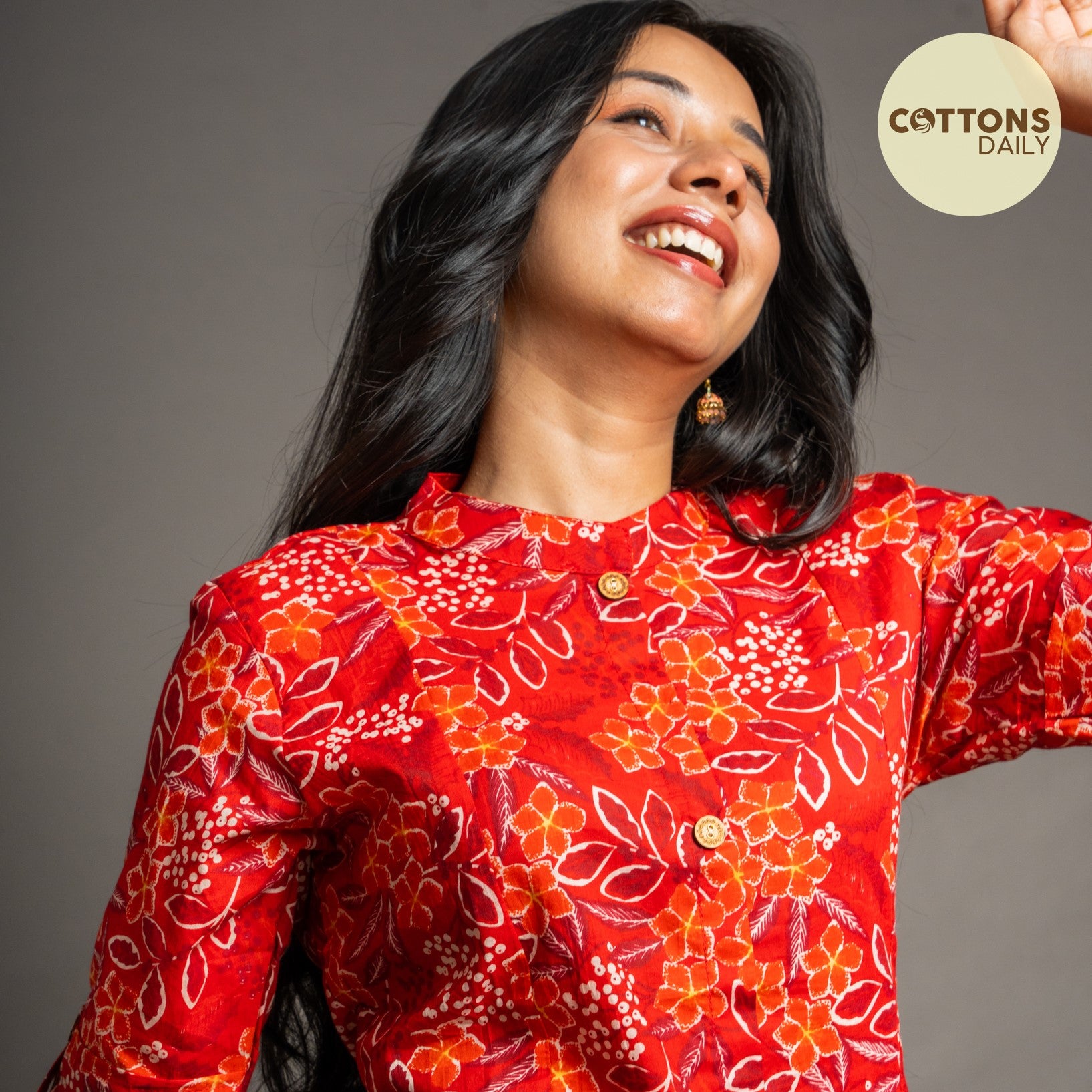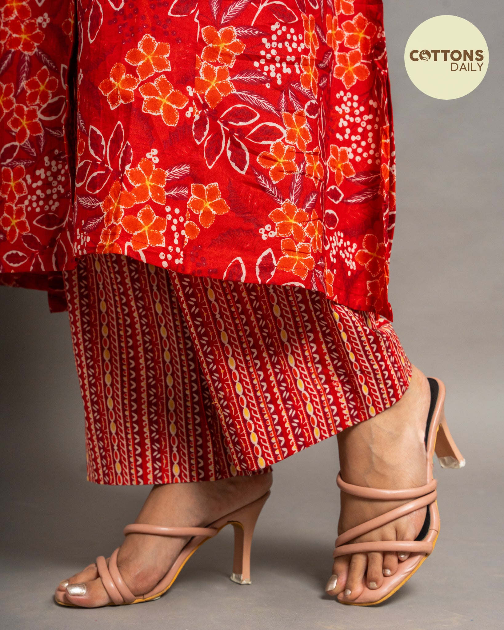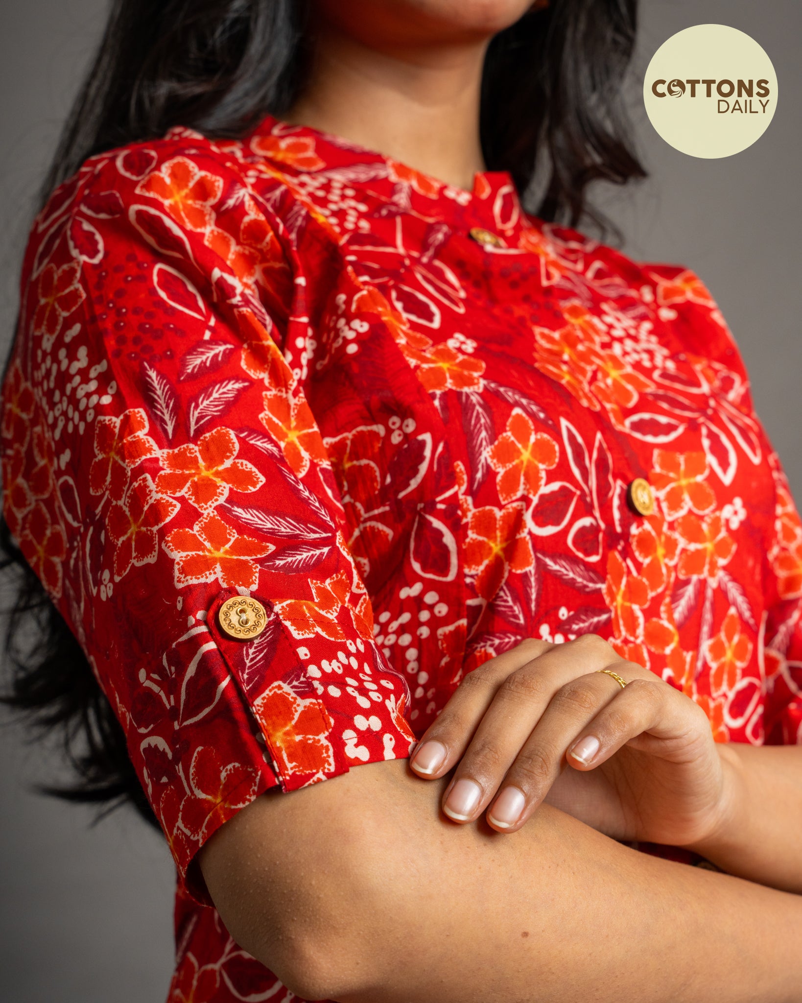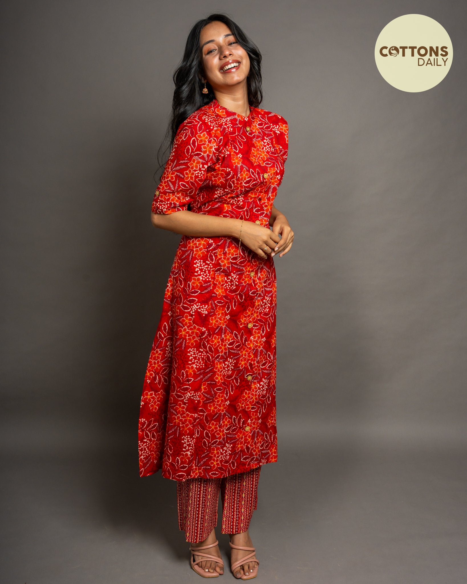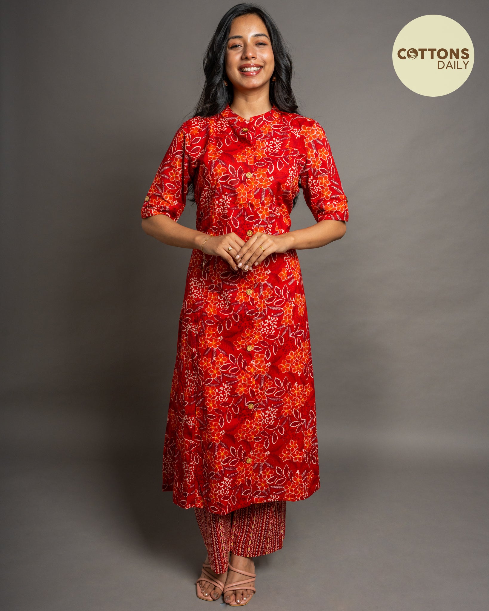-74% OFFRed Palm Leaf Printed Cotton Kurta