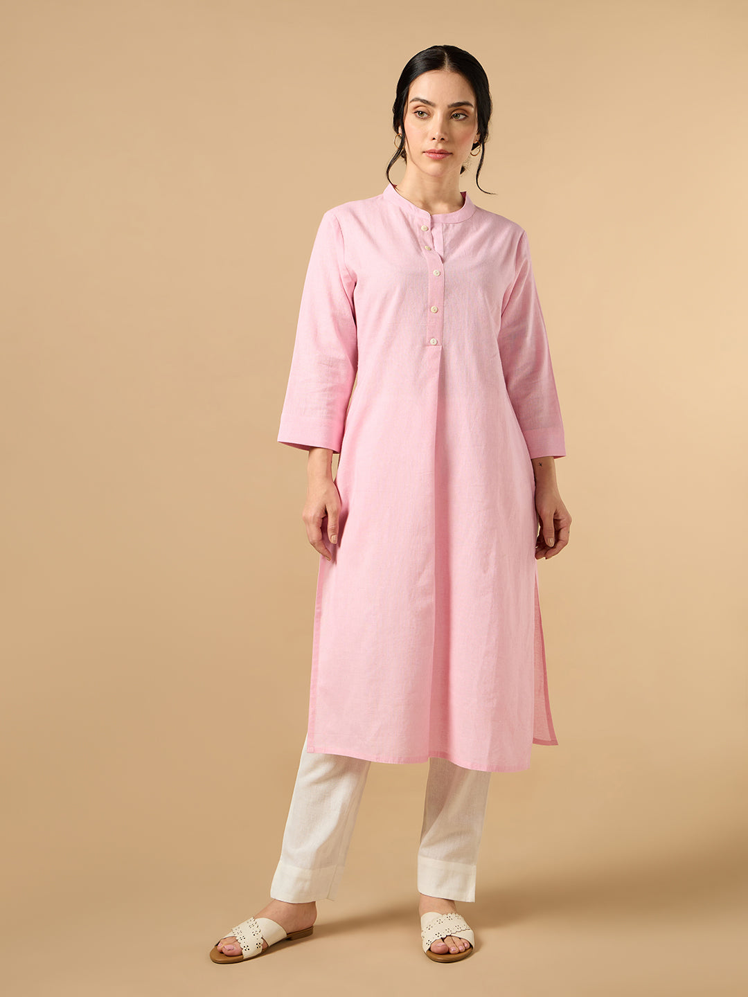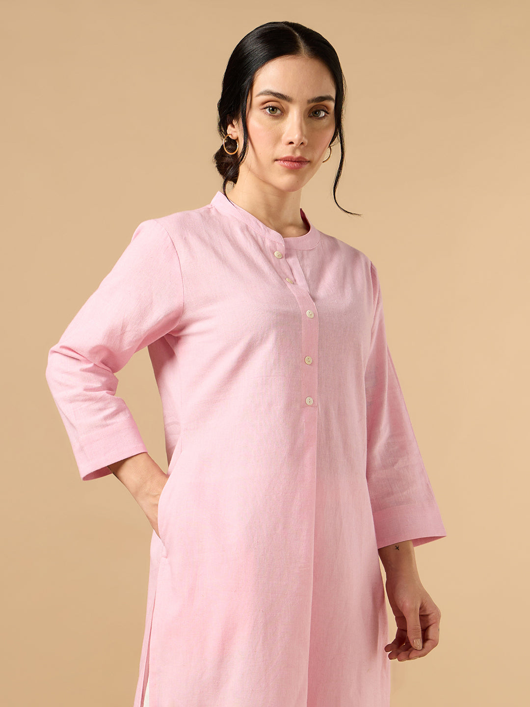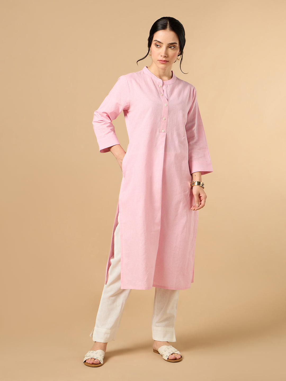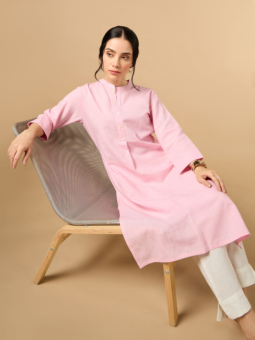 Step into effortless elegance with the Classic Linen Baby Pink Straight Long Kurta – a timeless addition to your ethnic wardrobe. Designed with a clean and minimalistic aesthetic, this long kurta is tailored from a breathable cotton-linen blend that keeps you cool and comfortable all day long.