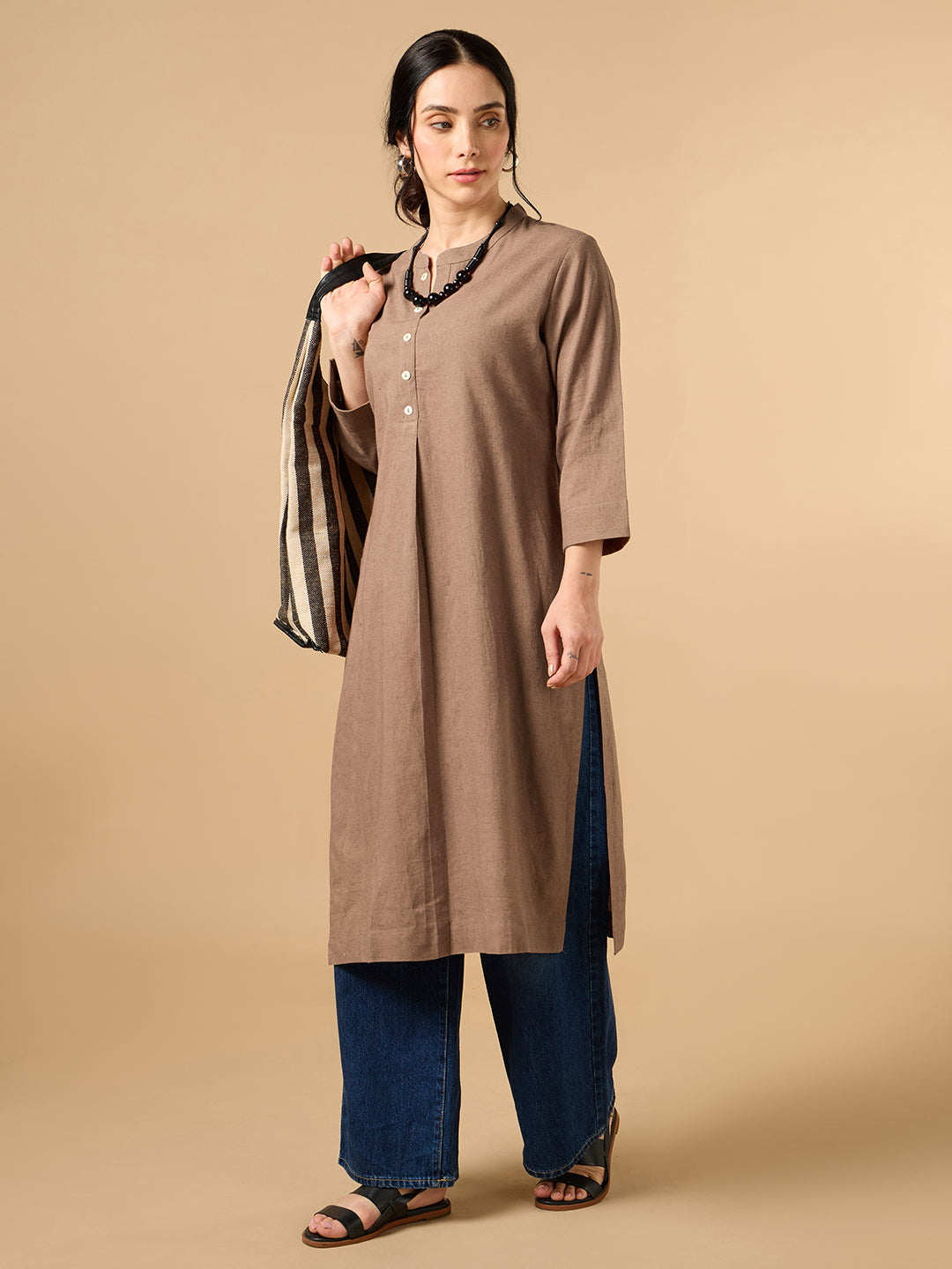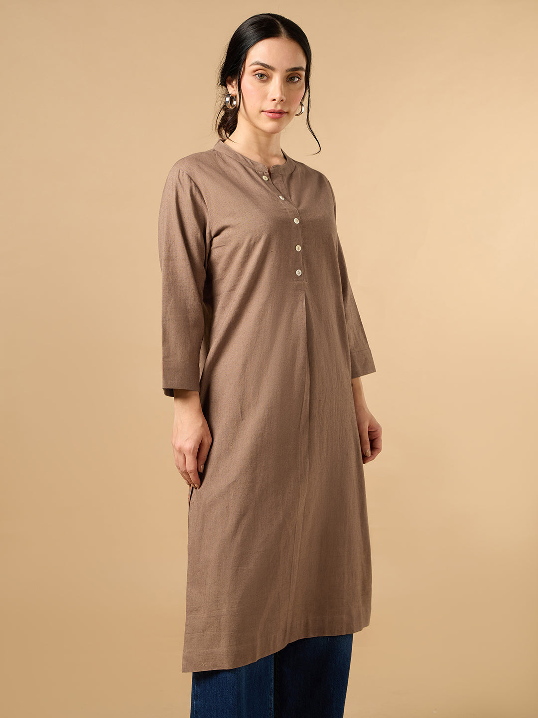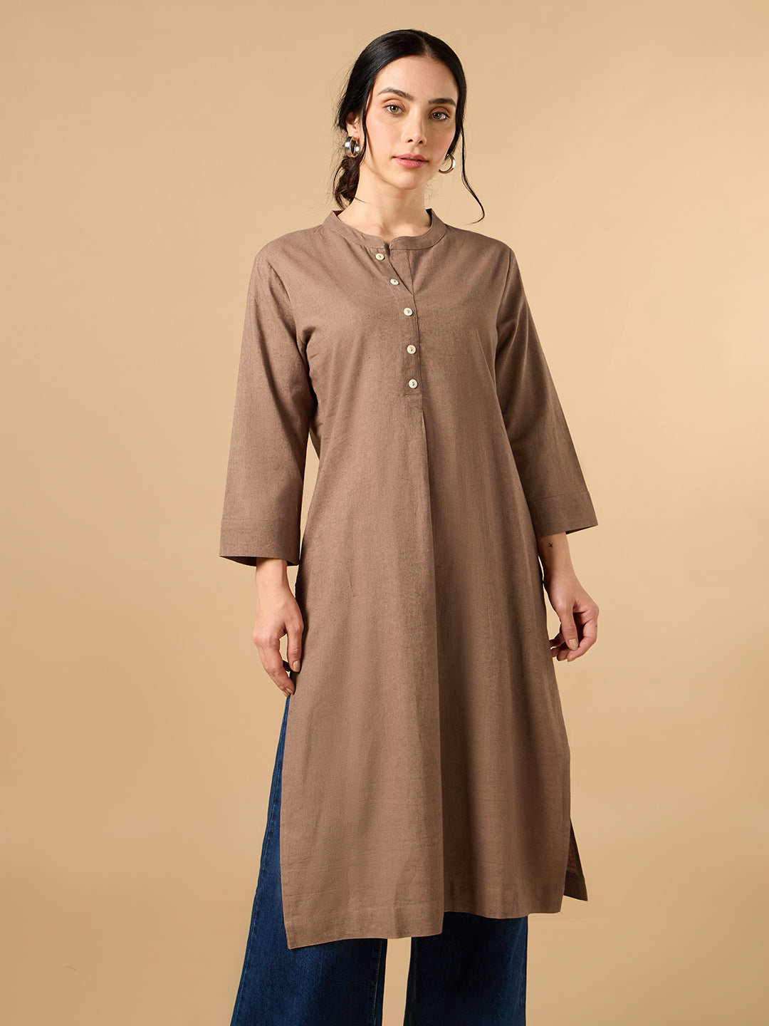 Classic Linen Light Brown Straight Long Kurta