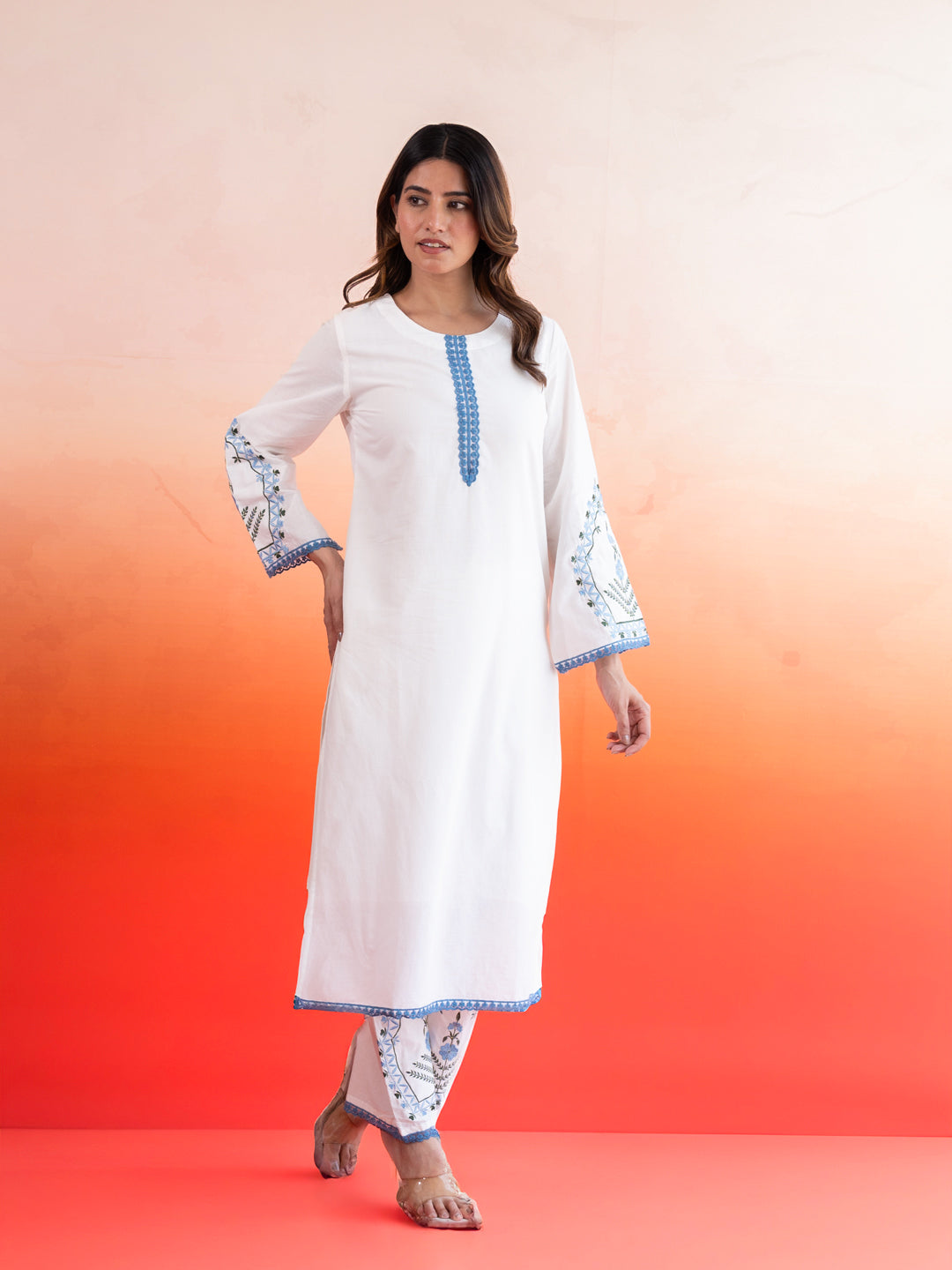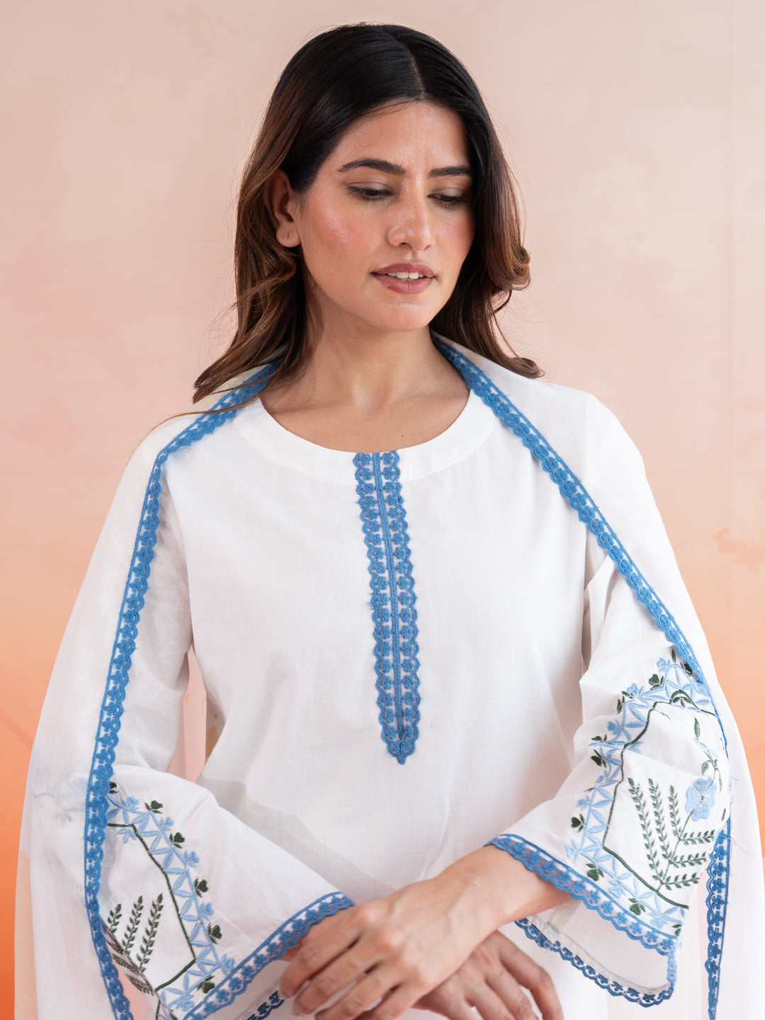 Elevate your wardrobe with the Classic White Blue Lace Work Cotton Suit—a blend of simplicity and grace. This elegant cotton kurta features delicate blue lace detailing on a pristine white fabric, creating a timeless and sophisticated appeal. Designed for comfort and versatility, it’s perfect for casual outings, office wear, or festive gatherings.