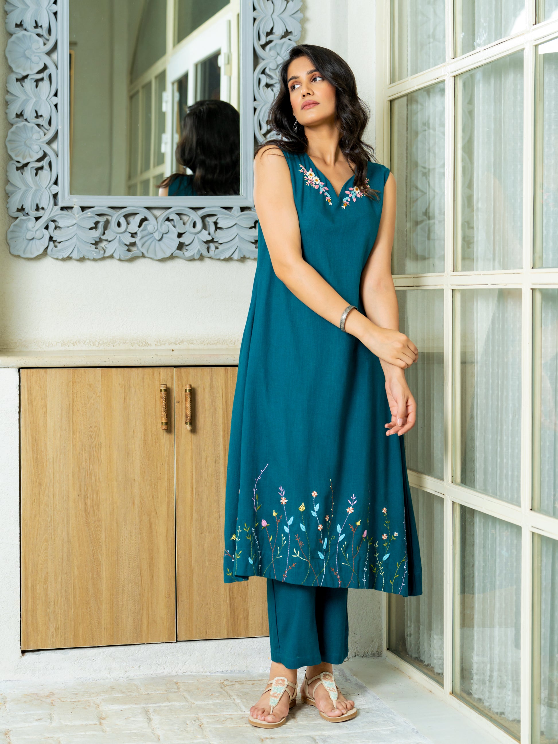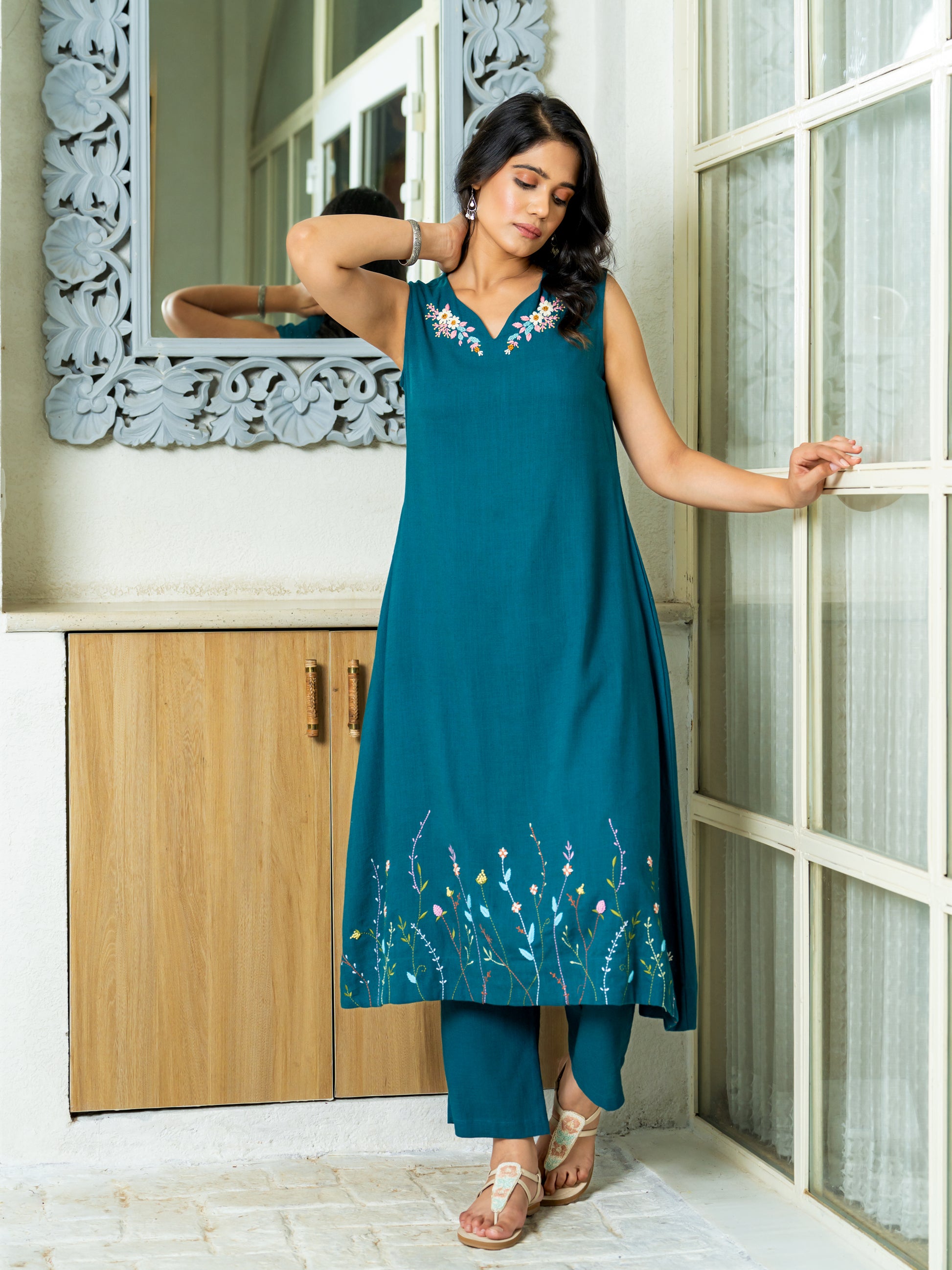 Elevate your wardrobe with our Empress Teal Hand Crafted Linen Co-ord Set, a perfect choice for those who value both comfort and style. Made from a soft cotton-linen blend, this embroidered sleeveless co-ord set is ideal for casual outings and professional settings, offering a chic look for any occasion.
